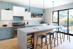 Les teintes profondes comme l’anthracite, le bleu nuit ou le gris graphite ajoutent une touche luxueuse, parfaite pour les cuisines ouvertes sur le salon.